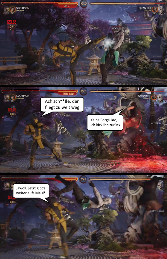 Etwas, das ich seit Mortal Kombat Armageddon vermisse, ist zurück: AIR KOMBAT! Ich hab es geliebt, meine Gegner in die Luft zu befördern und in bester Dragon-Ball-Manier in der Luft weiter zu vermöbeln. Es macht einfach Bock und gibt dem Ganzen viel mehr Spieltiefe.