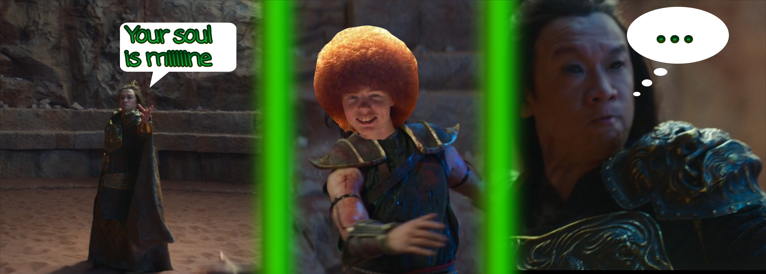 Weniger Perücke und mehr Mimik bitte. Shang ist vielleicht ein böser Zauberer, aber auch er zeigt in den Spielen Emotionen. Und was sollte der Scheiß mit Kung Lao? Wollt ihr mich verarschen? Der hat nicht eine ins Fressbrett bekommen und schon wird ihm die Seele geklaut? Wie overpowered ist Shang eigentlich?